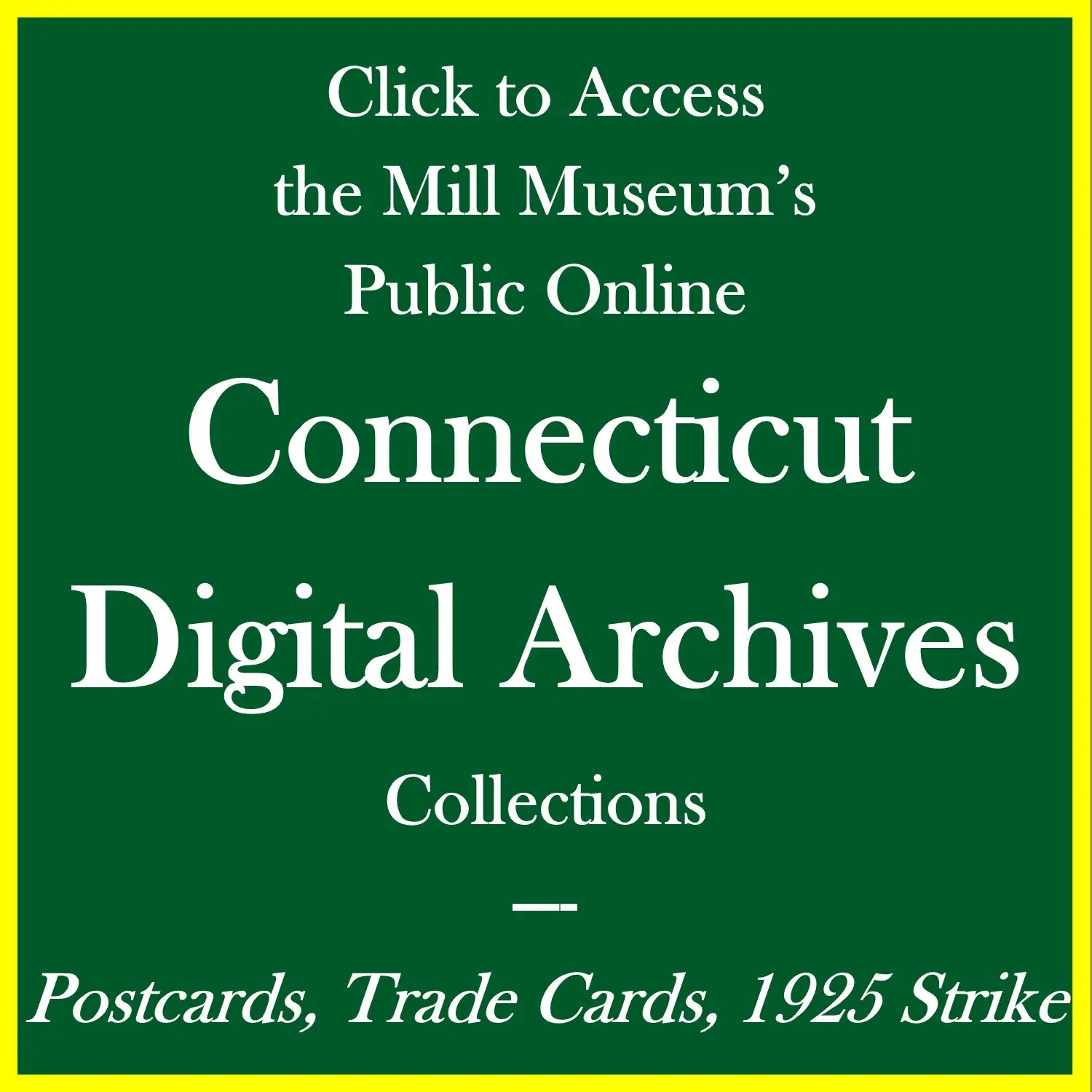 Curious about our collection of historical materials? The Mill Museum has more than 20,000 objects, photographs, documents, and other objects in our physical Archives, located on the third floor of the Museum’s main building, and the number keeps growing. We are slowly adding images and data from our physical Archives to our accessible, online CatalogIt Digital Collections Catalog, which you can access by clicking the maroon button below. The short video at the bottom of the page explains how to use and navigate our CatalogIt Archives. In addition, we have some of our collection (post cards, trade cards, and documents relating to the American Thread Company Strike of 1925) archived on the publicly accessible Connecticut Digital Archive (CTDA) at the Dodd Center at the University of Connecticut, which you can access by clicking the green button below.